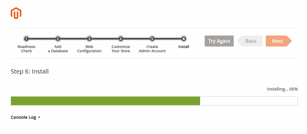 You are ready to install Magento 2. Click on "Install Now" button and Installation will be started with the following screen.