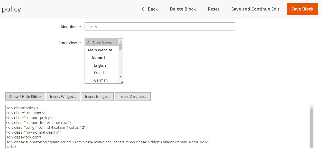 To create a static block,go to CONTENT > Blocks,click Add New Block button and follow these steps:
