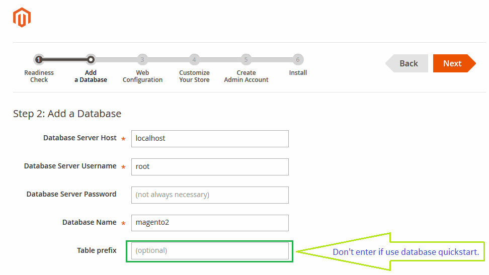 Create a database for Magento2 as by clicking on next from the screen 1, it will ask for the database details to install Magento 2.