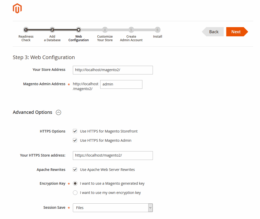 Screen 4 will ask for the web configuration. It will automatically take your store address and generate random admin url. You can edit to keep it whatever you want. There are few advanced options like HTTPS option, If you want your store with https url. You must need to set up SSL for your website. Apache Rewrite, Encryption key, and session save are additional options.