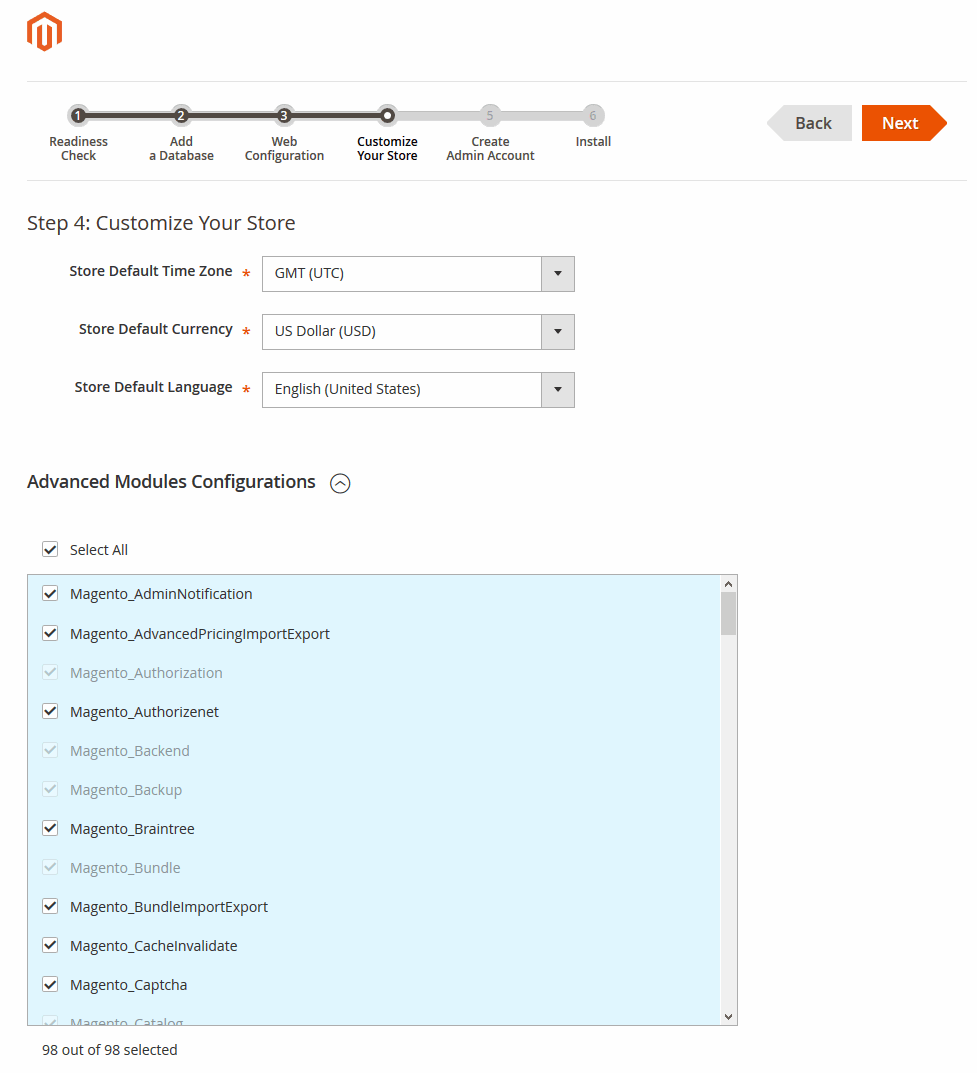 Screen 5 will be Customize your store option. Select Time Zone, country and Language for your store. You can also look for Advanced Module Configurations. Actually Magento 2 comes with the default extensions and allows you to choose the default extensions whichever you want to install.