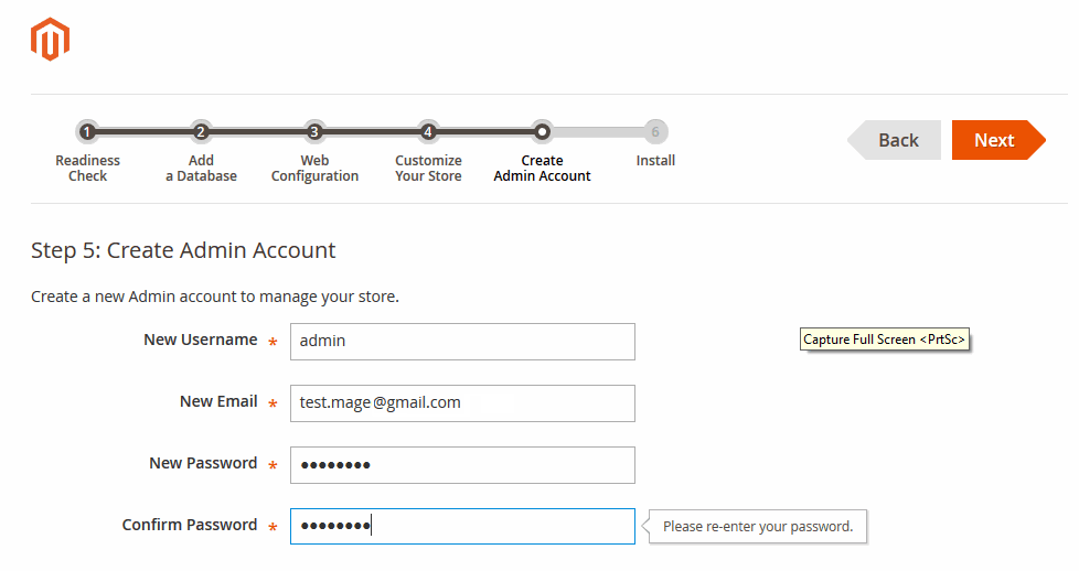 Screen 6 is for creating admin account. Enter username, email and password and click on Next.