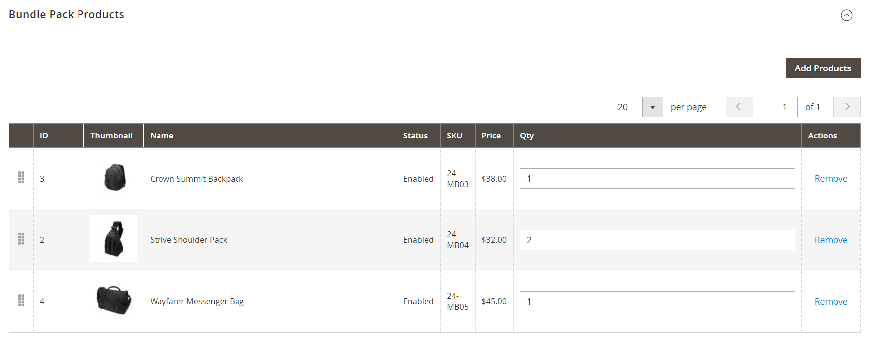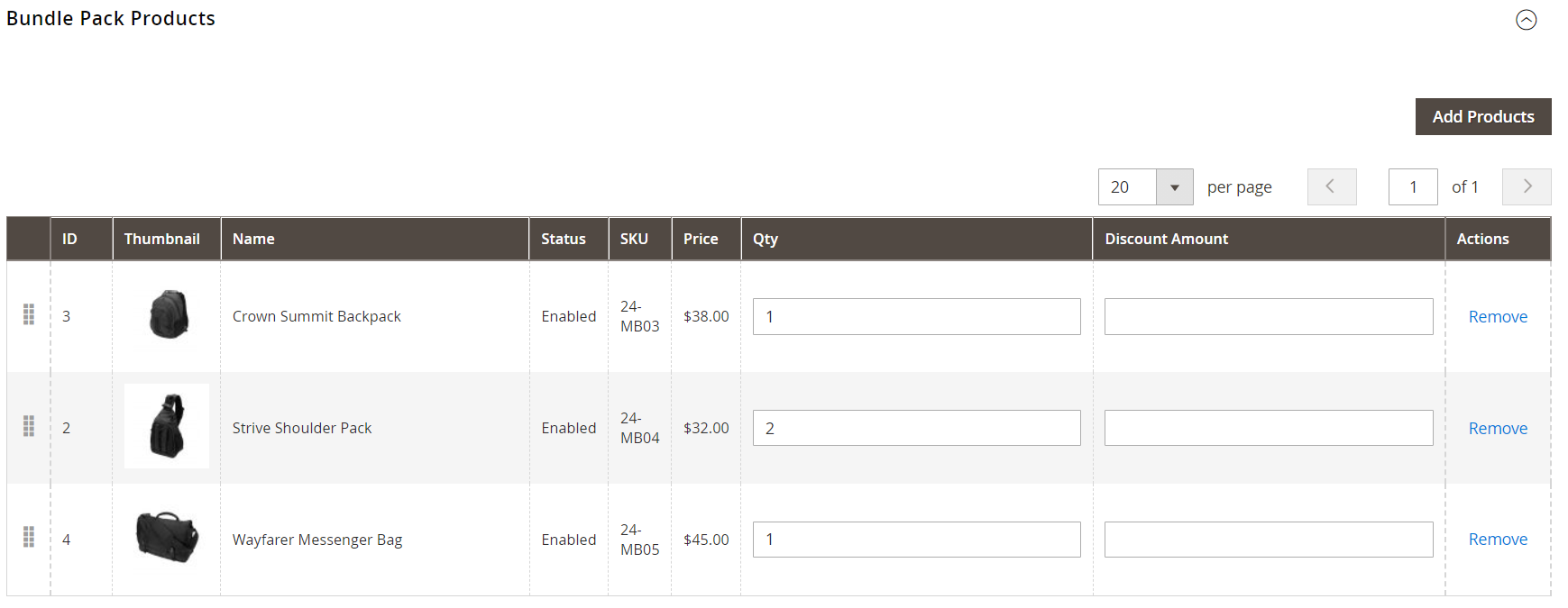 Choose bundle pack products accordingly. Choose the order of bundle pack products on the appropriate grid via drag-and-drop and specify each bundle pack product quantity and discount amount.