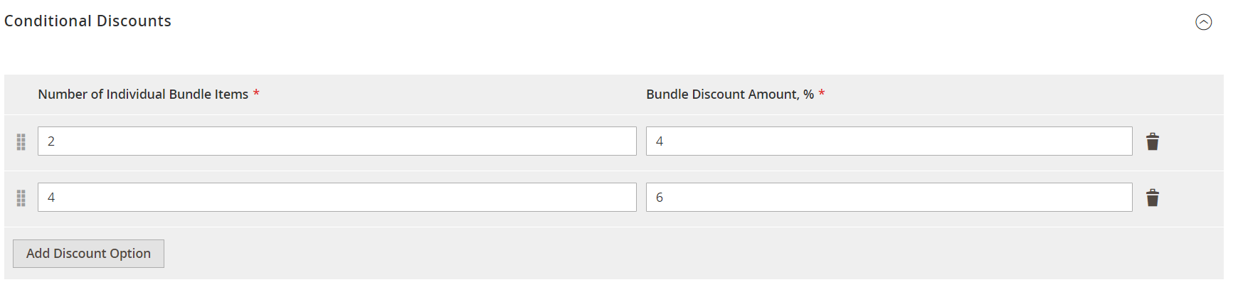 Explanation of above settings: with 2 selected bundle products, those products will get 4 percent discount; with 3 selected bundle products, those products will also get 4 percent discount and if there are 4 or more selected bundle products, those products will get 6 percent discount.