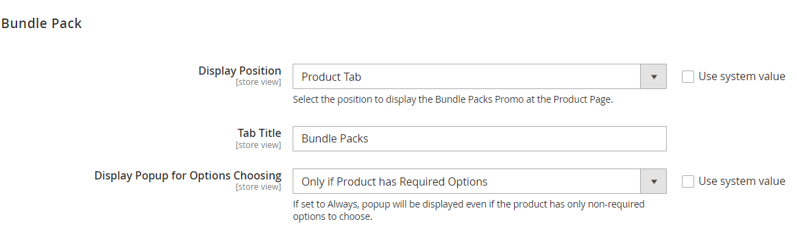 Display Position - choose the position to display product bundle packs: below product info or on a product tab.