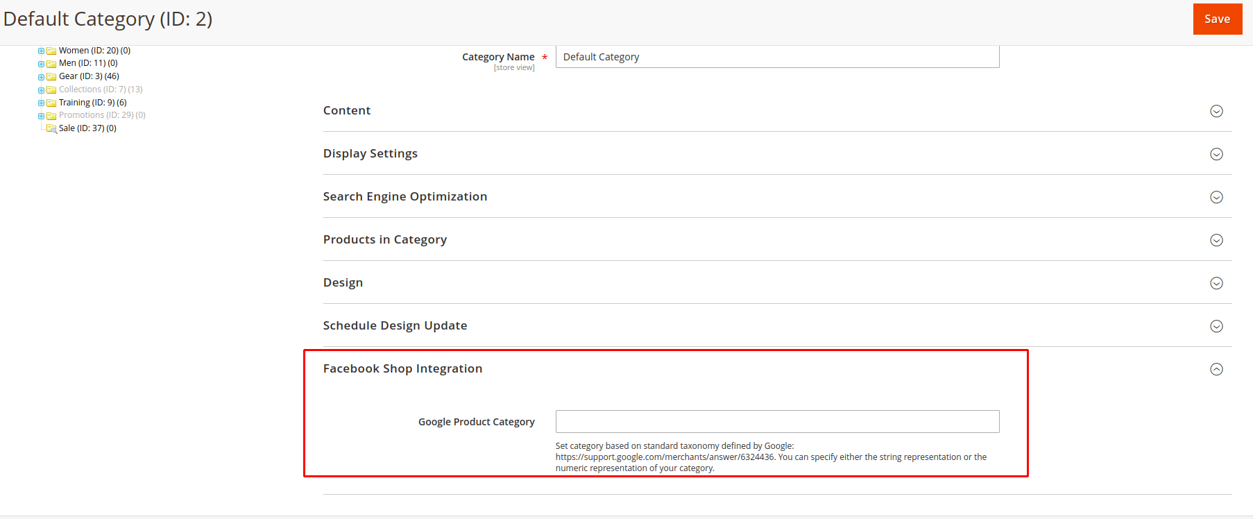 Login to Magento Admin > Catalog > Categories > Choose category > Facebook Shop Integration.