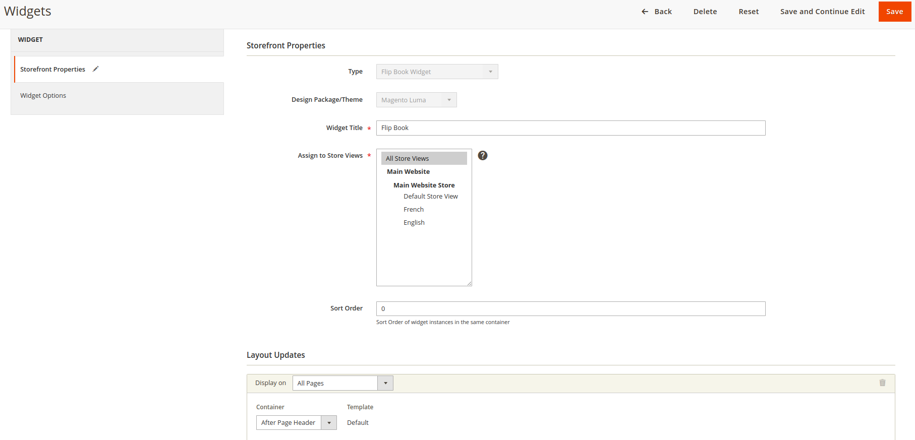 Add widget title, assign store views, sort order and in layout updates to display on pages the example shown below.