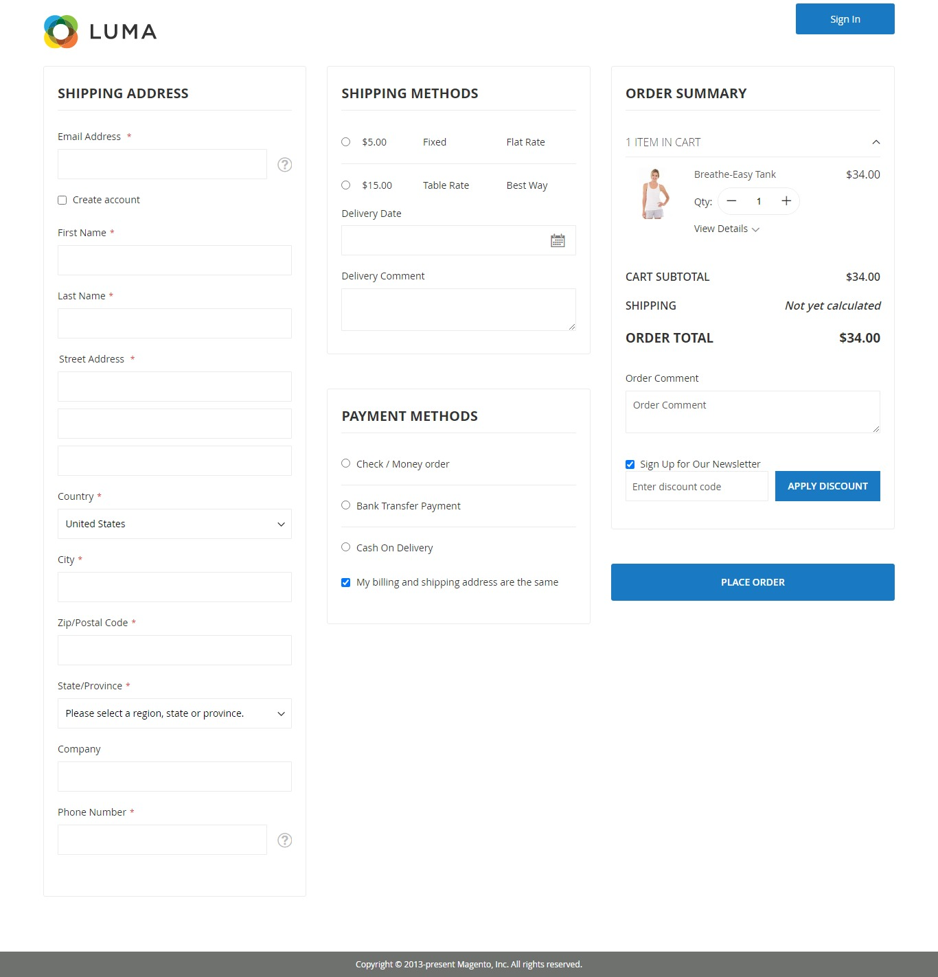- Show Billing Address: Select Yes to allow the Billing Address block to appear in the Checkout Page, or No to imply that Billing Address and Shipping Address are the same.