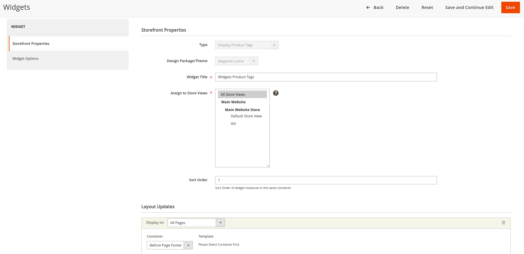 Add widget title, assign store views, sort order and in layout updates to display on pages the example shown below.