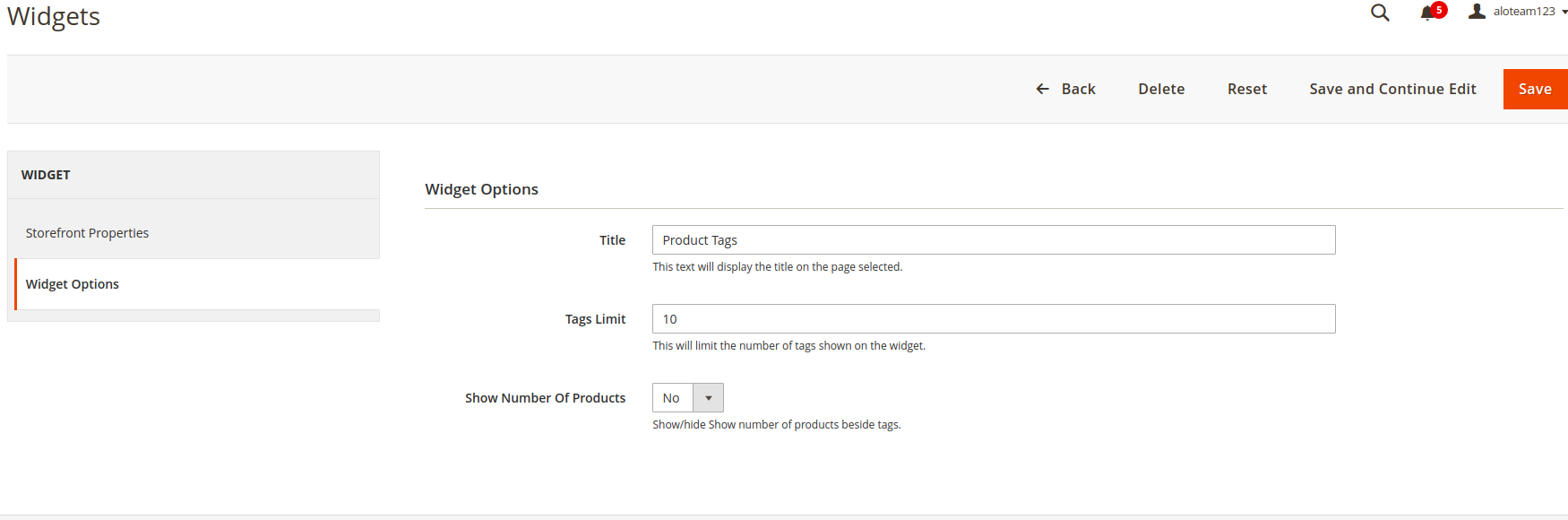 Add new widget.Login to Magento Admin > Content > Widgets > Add Widget > In type choose Display Product Tags > In design theme, choose the theme you want to use => Click continue.