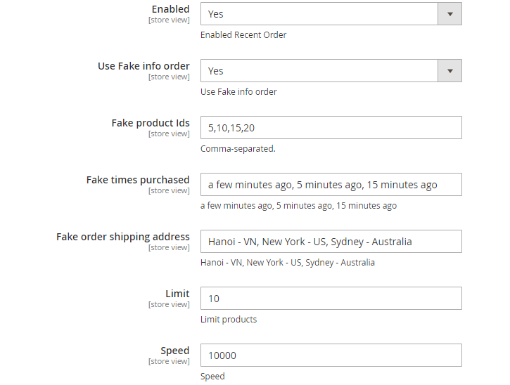 To Enable/DisableMagepow Recent Order Notification Extension: Go to Admin Panel > Stores > Settings > Configuration > Magepow > Recentorder. Then, select Yes to Enable module/No to Disable the module