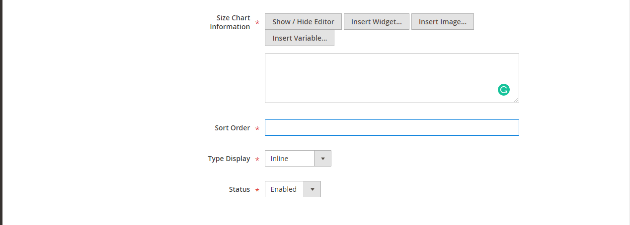 - Status: Select Enable/Disable for turning on/off the size chart rule.