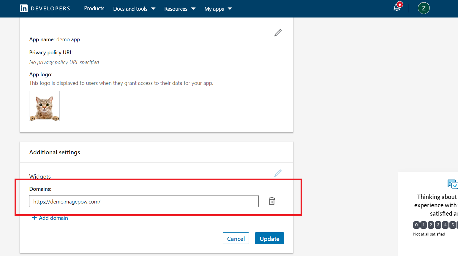 In Settings tab, role to bottom and fill Domains field with your website's url