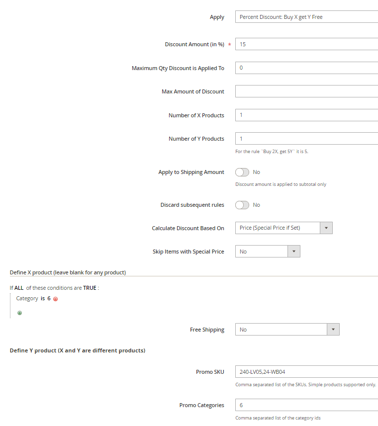 I keeps previous settings and add only number 6 in Promo Categories field. When you set value on both Promo Categories and Promo SKU fields, Y products will be the combination of both fields. In this case, Y products are LifeLong Fitness IV, Push It Messenger Bag and every product in category 6.