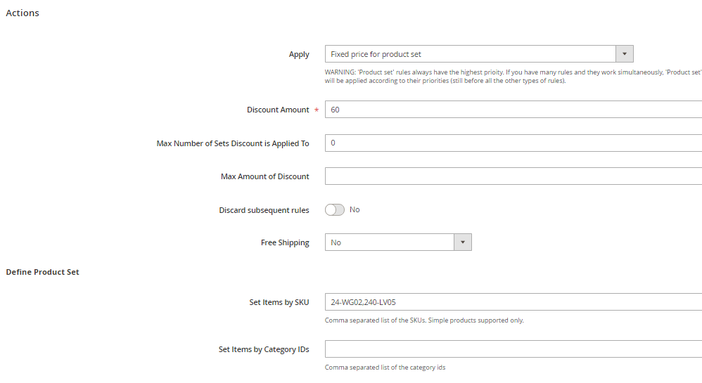 This action works exactly the same as Percent discount for product set above, but it will give a fixed amount of discount instead of percent discount.