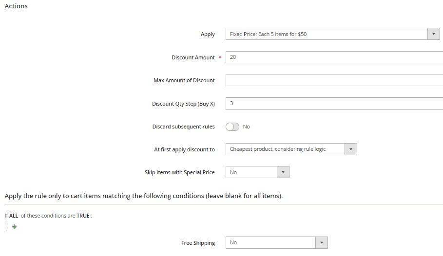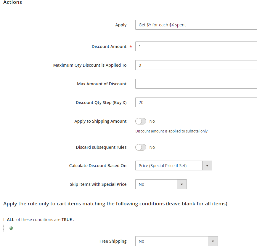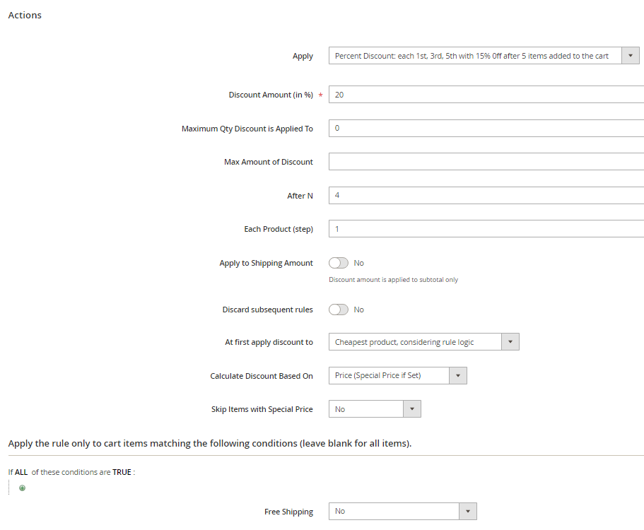 Apply to Shipping Amount - enabled this option only if you want to apply the discount to the sum of the Subtotal + the Shipping Rate. We don't need this for our promotions, so we set to 'No'.