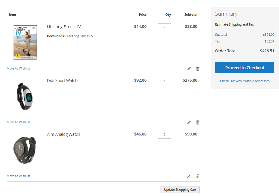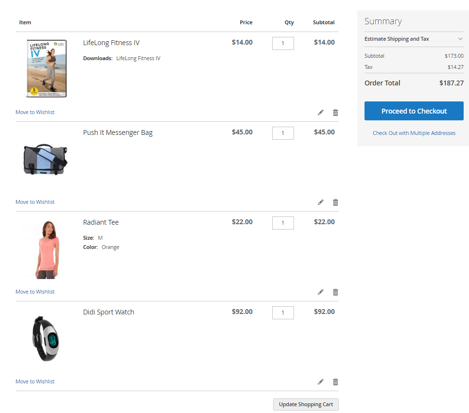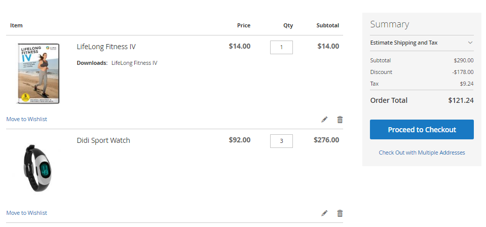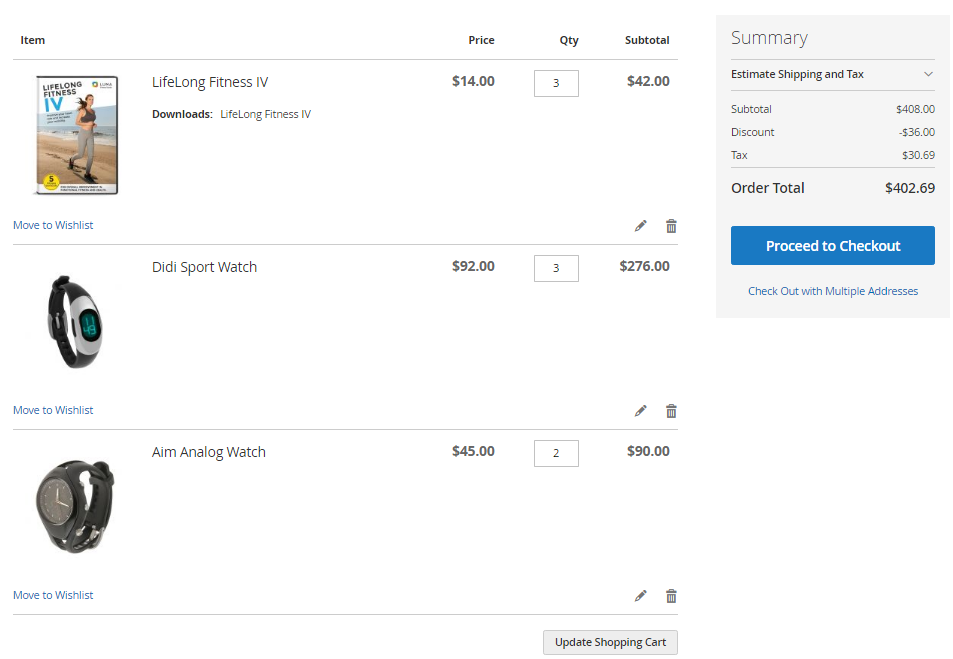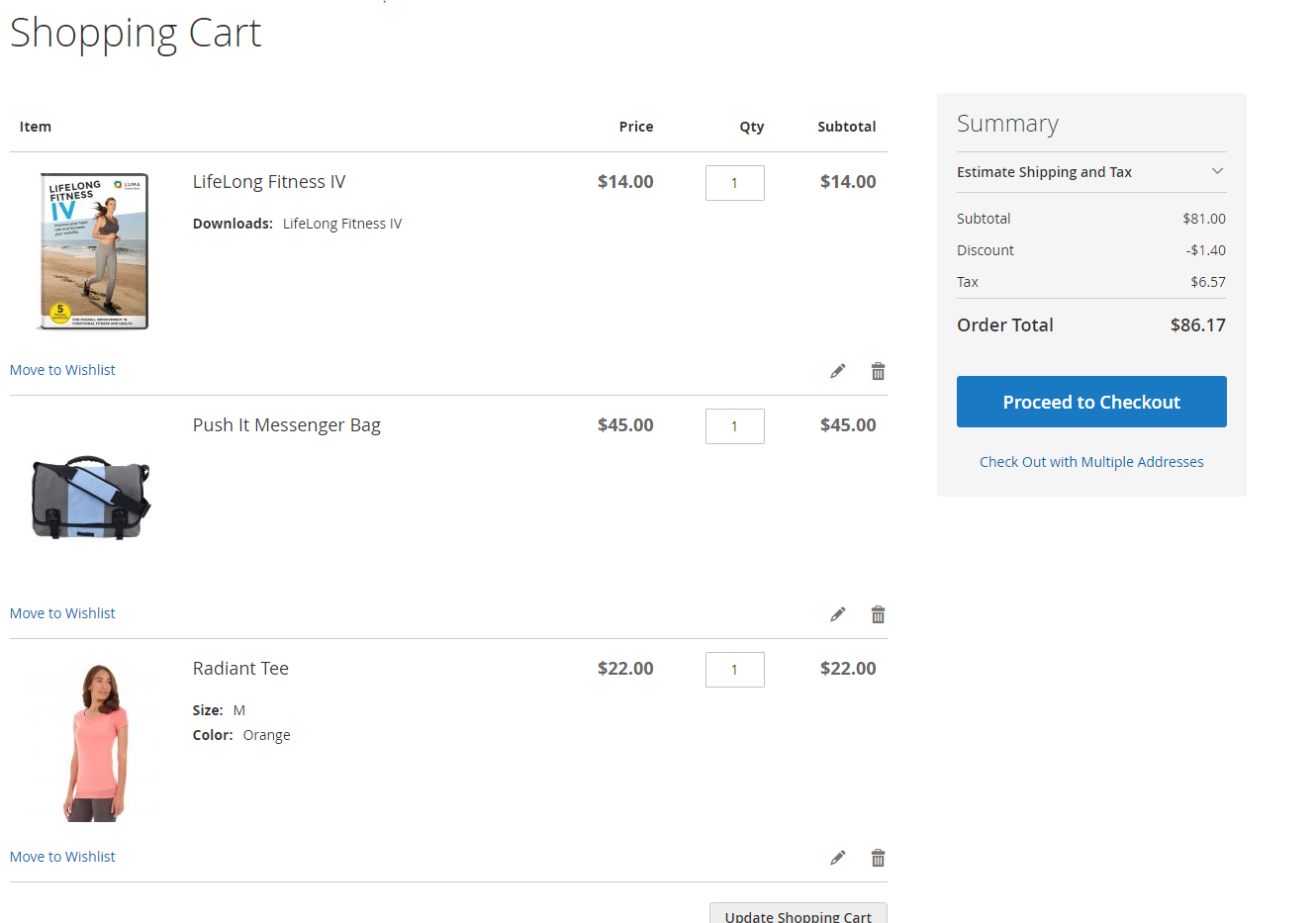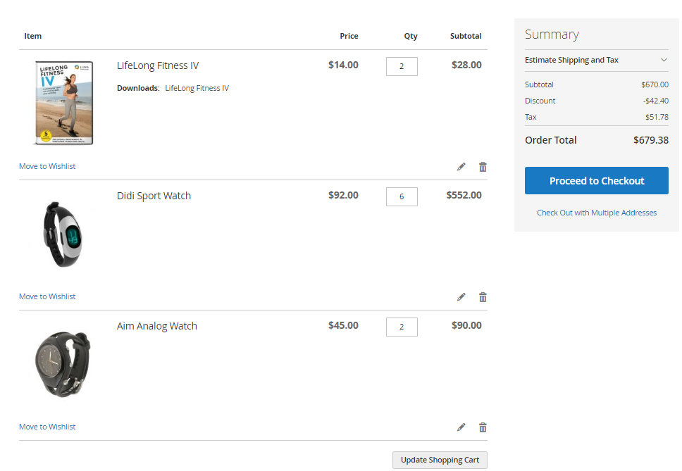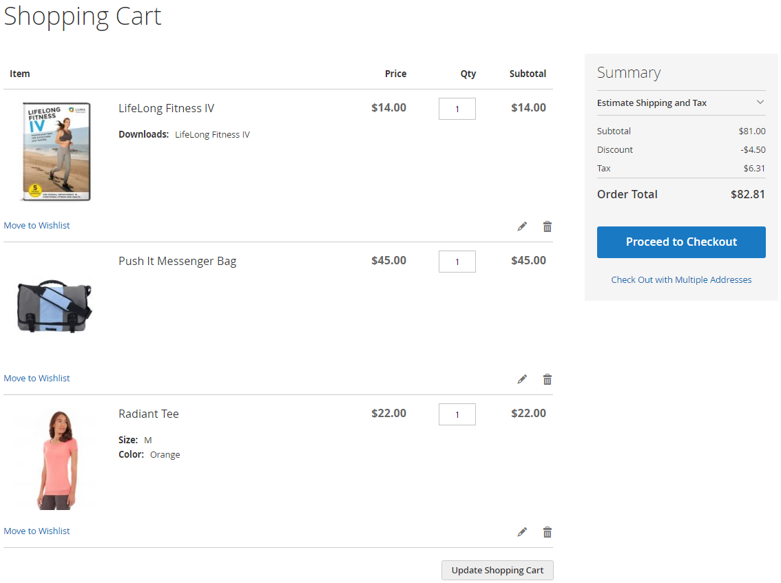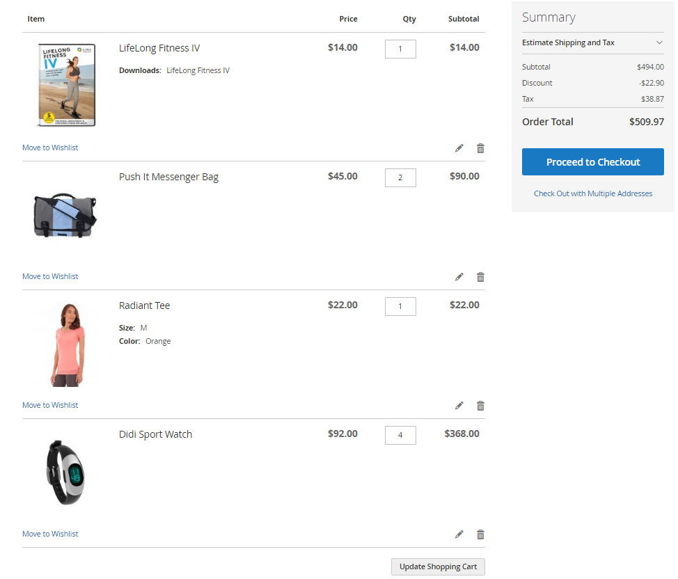 Note, that the discount will be applied to each second item in the cart and items sort from lowest to highest price - the Use For field is set to All Products in Shopping Cart and At first apply discount to field is set to Cheapest product. Now in cart, the rule counts LifeLong Fitness IV as 1st, Radiant Tee as 2nd, Push It Messenger Bag have quantity is 2 so it will be counted as 3rd and 4th and Didi Sport Watch: as 5th. Base on the rule, only 2nd and 4th items get discounted. So $22 * 10% = $2.20 sum with $45 * 10% = $4.50. We have $6.7. Match!