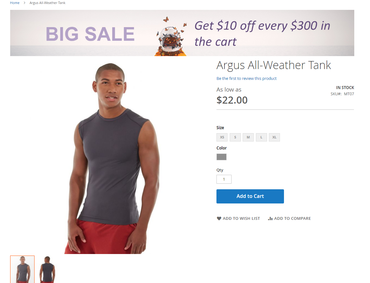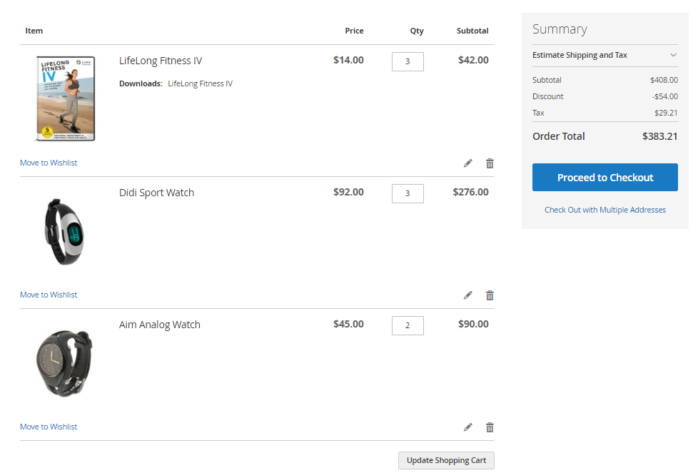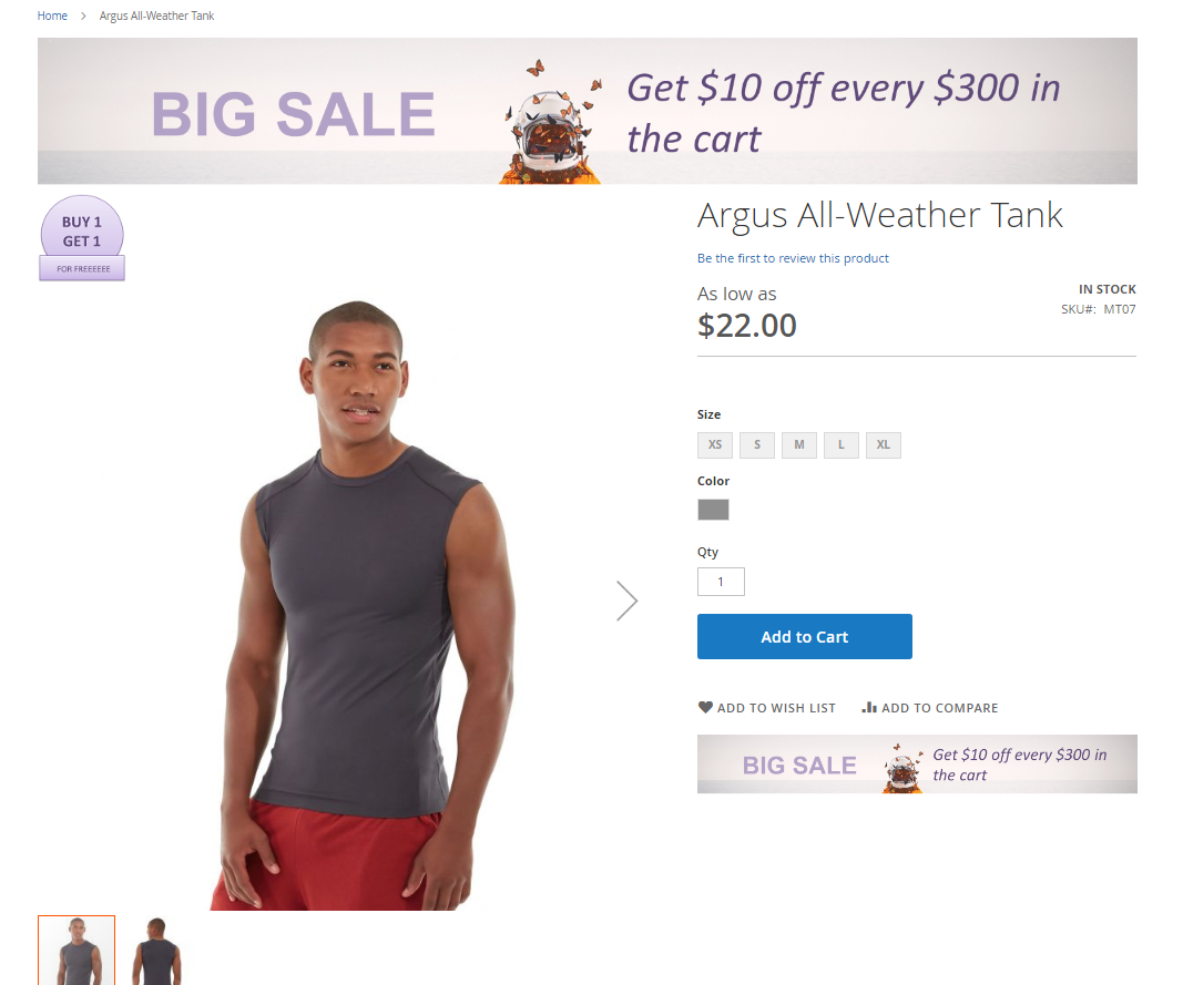I created a promo rule, that offers a set for $50. The set is comprised of 1 LifeLong Fitness IV and 1 cheapest product from Watchs category: Aim Analog Watch.