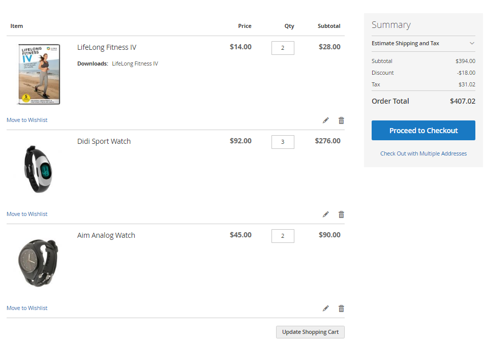 In cart still have 2 Aim Analog Watch so due to the rule settings 2 X product for 4 discount of Y product, this time LifeLong Fitness IV qty is less than 4, so the rule will continue apply discount to 2 more valid items
