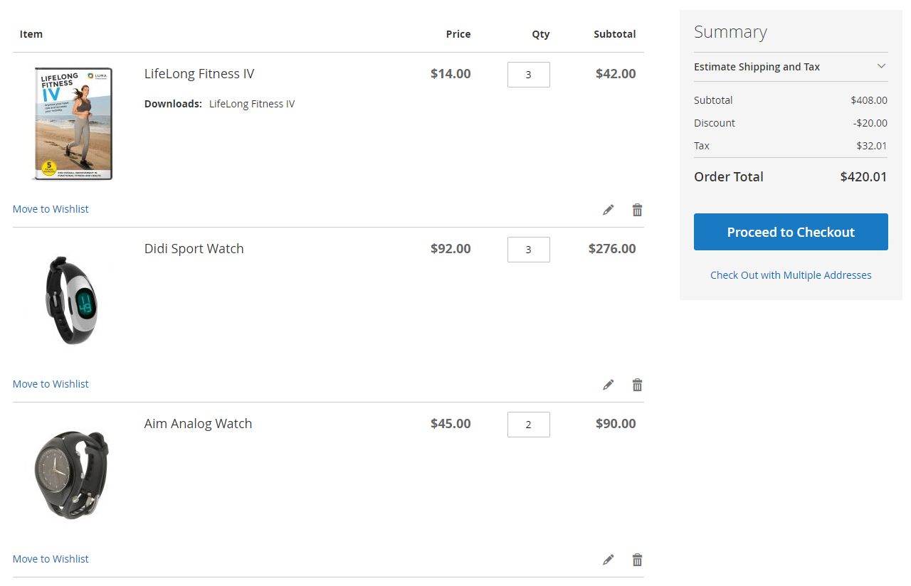 LifeLong Fitness IV have qty is 6, 6 > 4, so all 4 items receive discount will be LifeLong Fitness IV.The discount amount is $14 * 4 * 20% = $11.20.