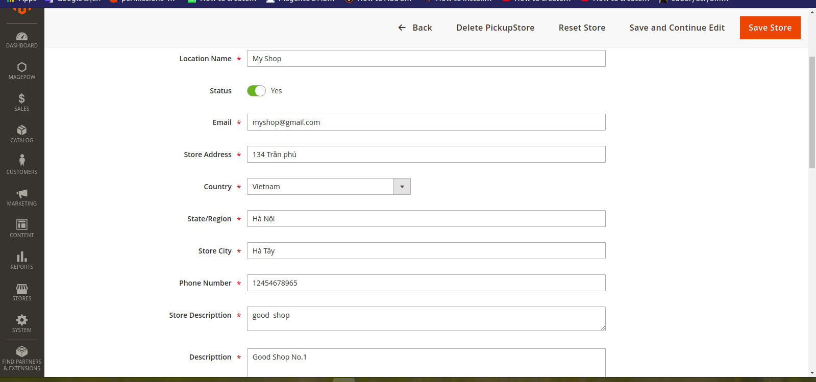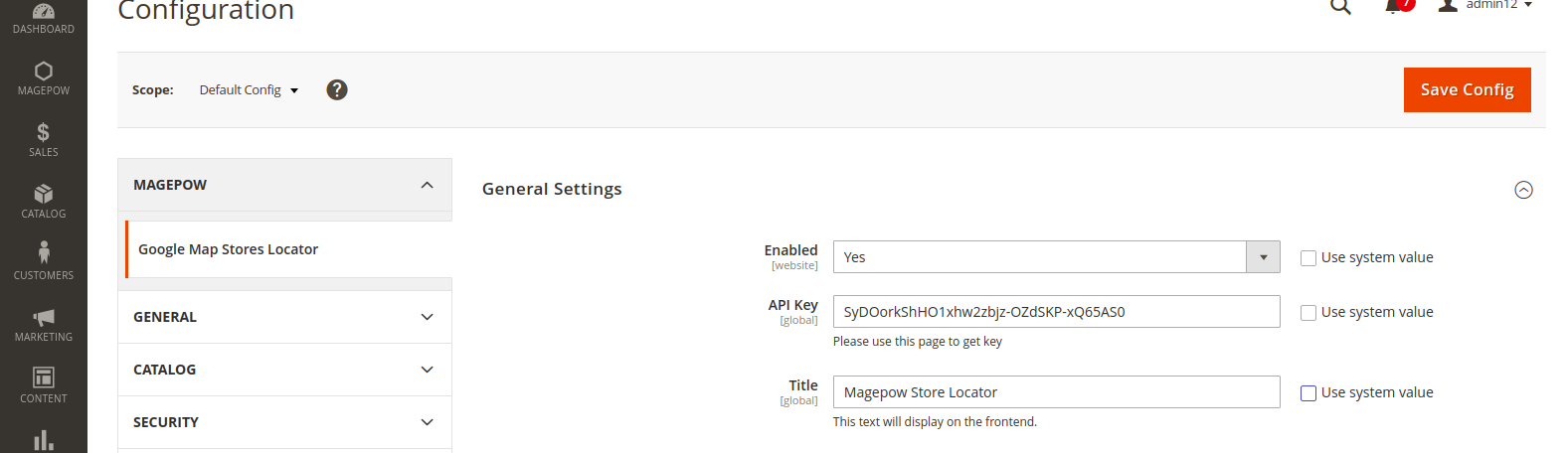 To Enable/DisableMagepow Store Pickup Extension: Go to Admin Panel > Stores => Configuration => Magepow => Google Map Store Locator => General Setting. Then, select Yes to Enable module/ No to Disable the module