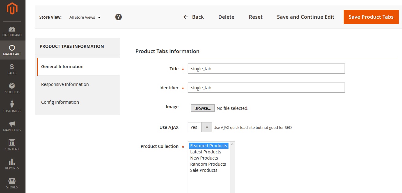 Magiccart >Magic Product > Product >Add New Product Tabs > set Config as image below.