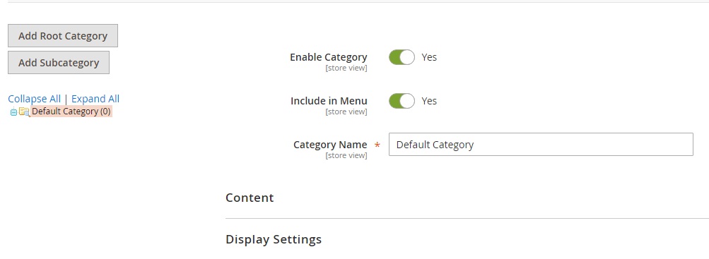 Categories section of the admin panel. After installation of Magento your category tree is almost empty, there is only the root category (name Default Category):