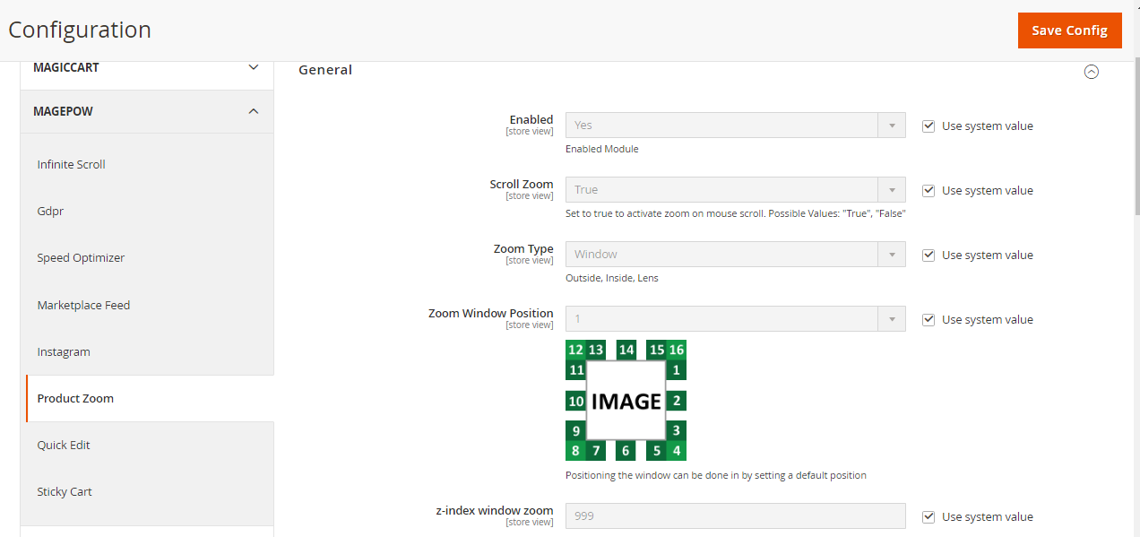 To Config and Manage Product Zoom, go to Admin Panel > Stores > Settings > Configuration > MAGEPOW > Product Zoom as the image below