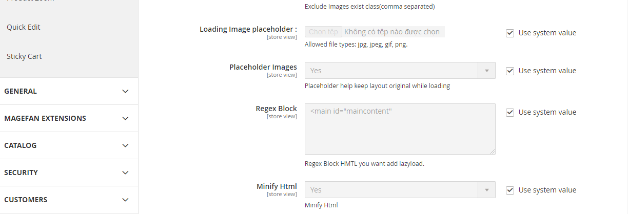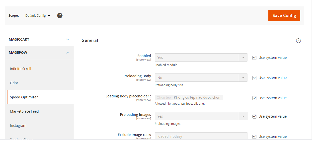 To Config and Manage Speed Optimization, go to Admin Panel > Stores > Settings > Configuration > MAGEPOW > Speed Optimizer as the image below