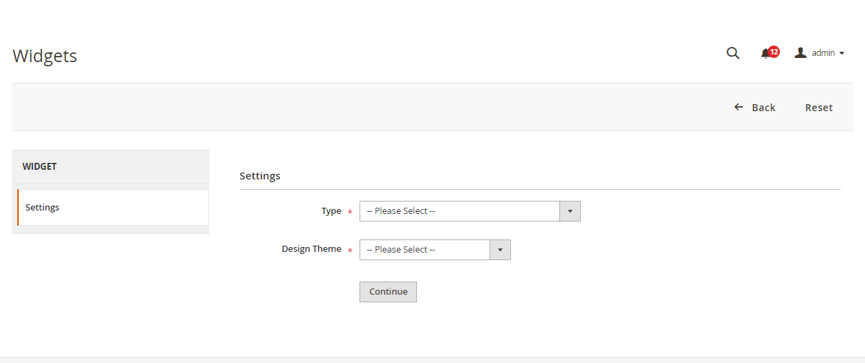 This is the interface of widget instance after clicking continue, Type and Design Package have already filled so you just need to fill Widget Title, choose Store View and Sort Order. After that, choose layout update