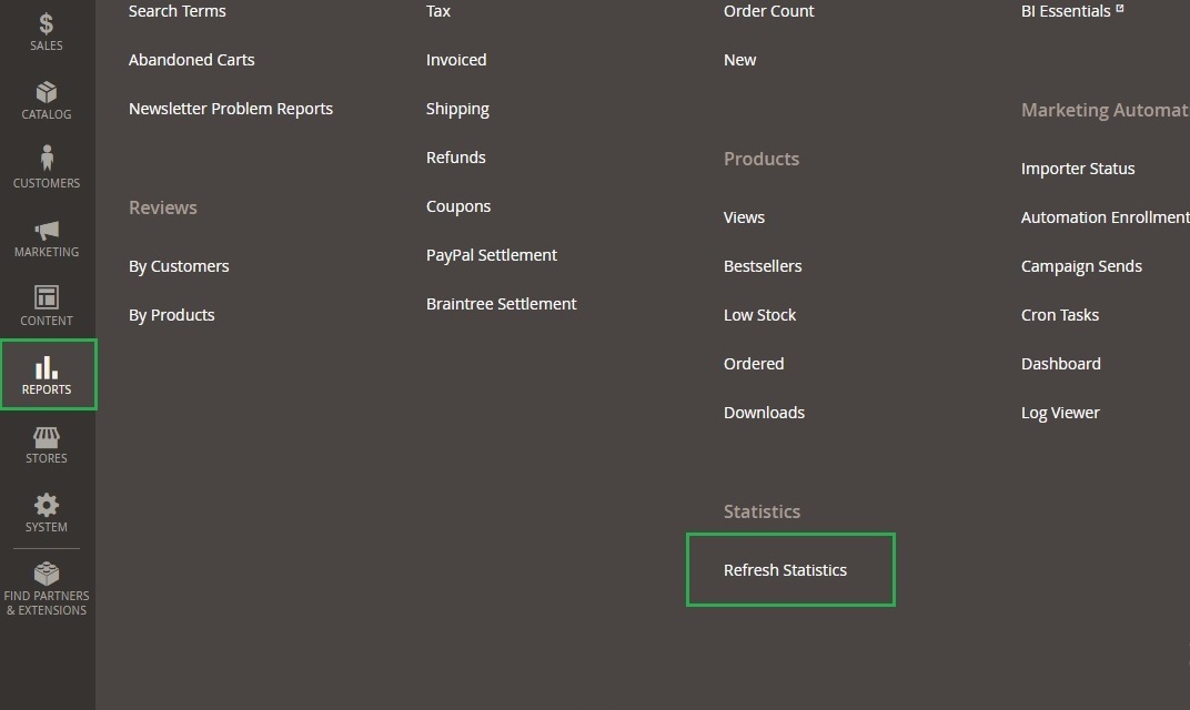 Reports >Statistics >Refresh Statistics > Refresh all Statistics in this section..