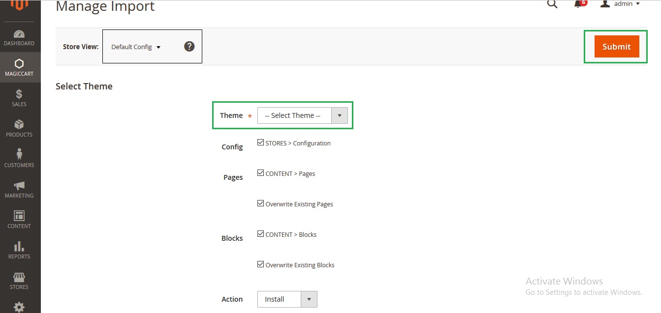 3. Go to Magento Admin: Admin > Magiccart> ALO Theme > Import