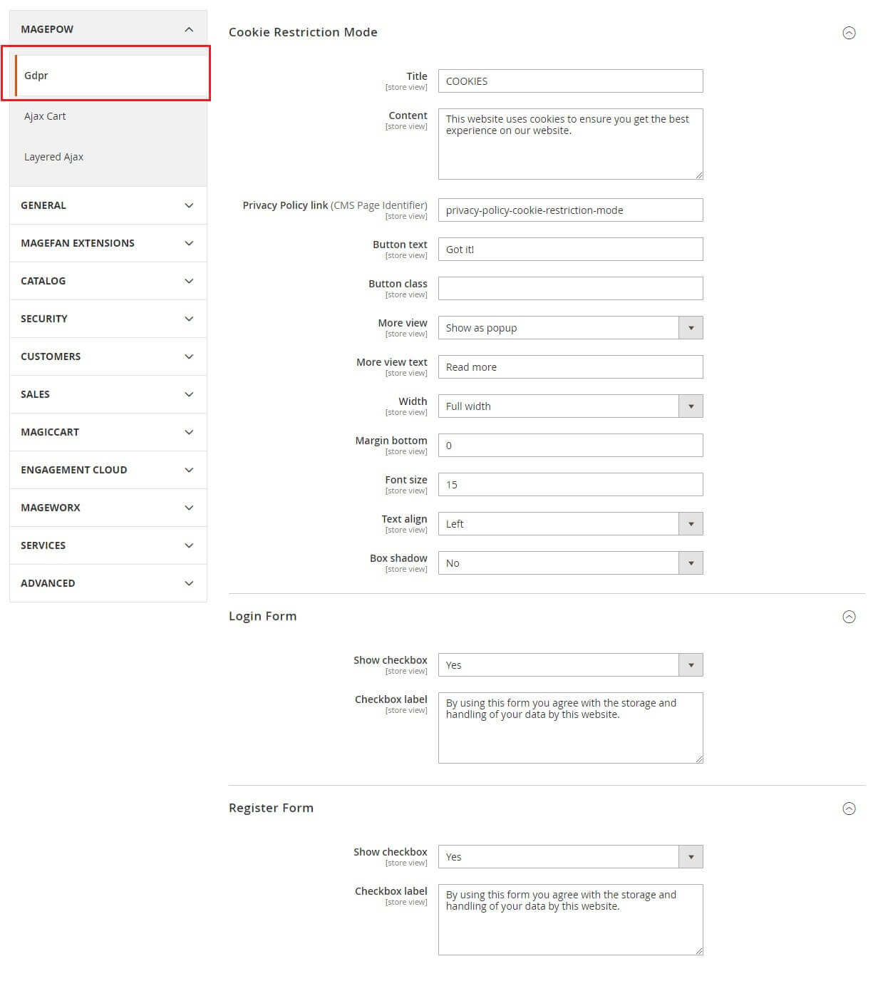 To Config and Manage Ajax Cart, go to Admin Panel > Stores > Settings > Configuration > MAGEPOW > Gdpr as the image below