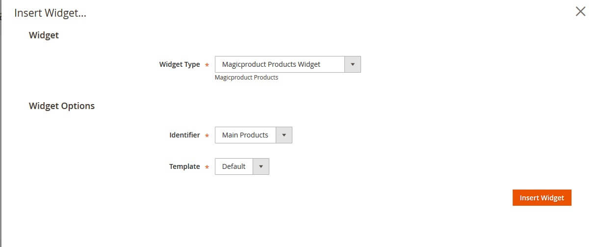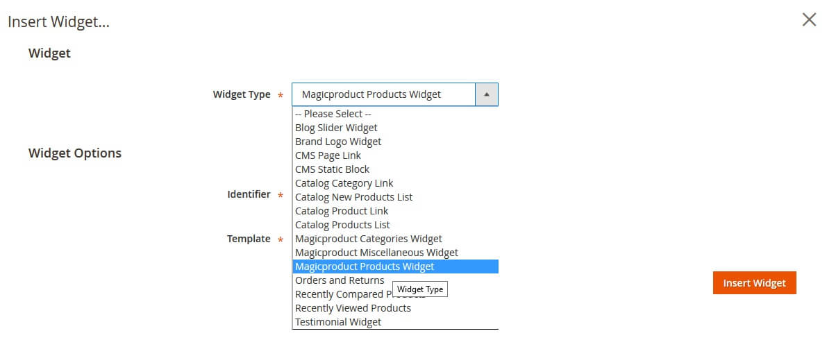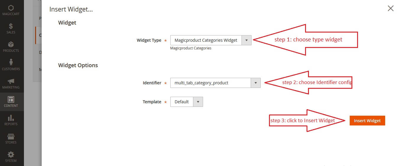 Then choose the "Widget Type" is Magicslider Widget and choose the Identifier and Template for the slider as the image below: