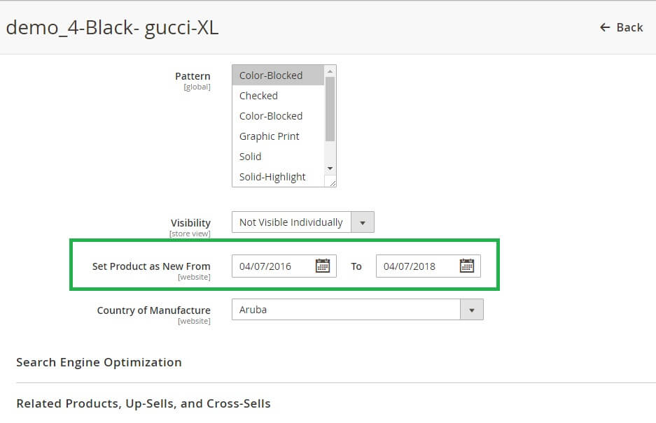 For products which have options (like configurable productsor bundle products) you can change position of the options box on product page. It can be displayed in the main column(next to the product images),or in the column below images.Select a product in CATALOG > Product,open Design option and select position in Display Product Options Infield: