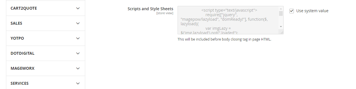 To Config and Manage Speed Optimization, go to Admin Panel > Stores > Settings > Configuration > MAGEPOW > Speed Optimizer as the image below