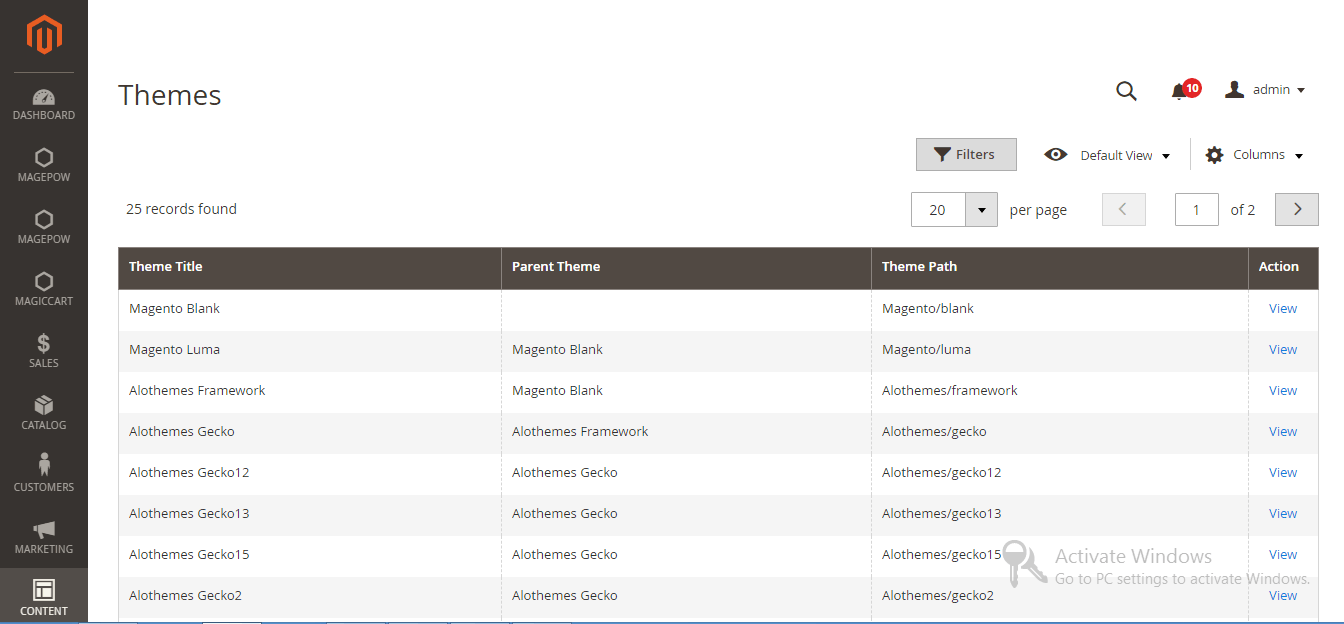 Go to CONTENT > Design -> Theme You will the list of default and custom themes in Magento 2 including Luma and Blank Theme.There will be the place where you can view all themes you have in your store