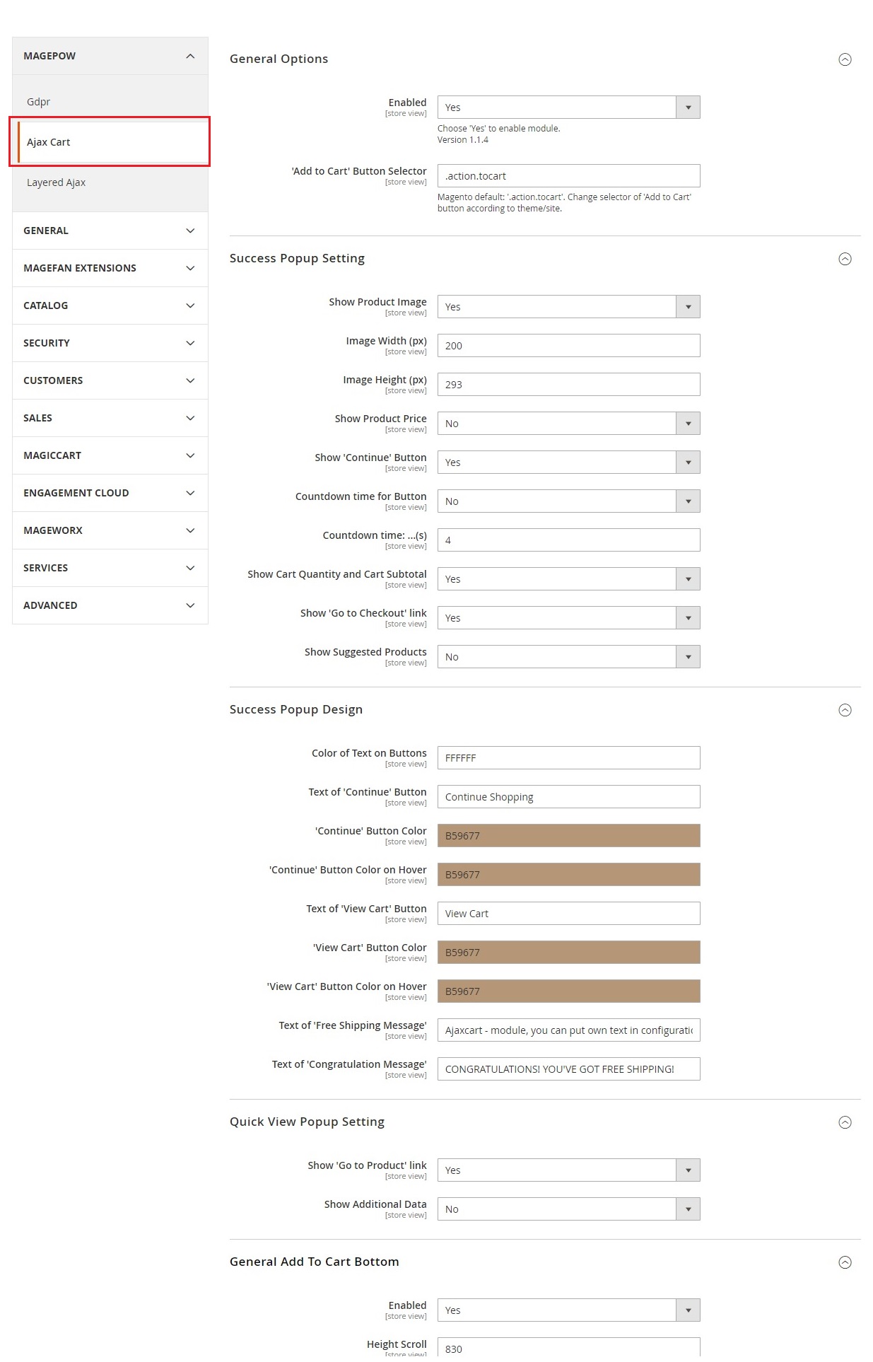 To Config and Manage Ajax Cart, go to Admin Panel > Magiccart > ALO themes > Configuration > MAGEPOW > Ajax Cart as the image below