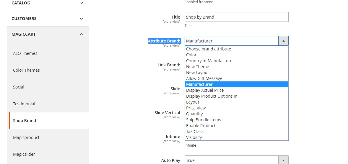 of a dropdown attribute manufacturer which stores a list of product brands.Fill in the form as follows: