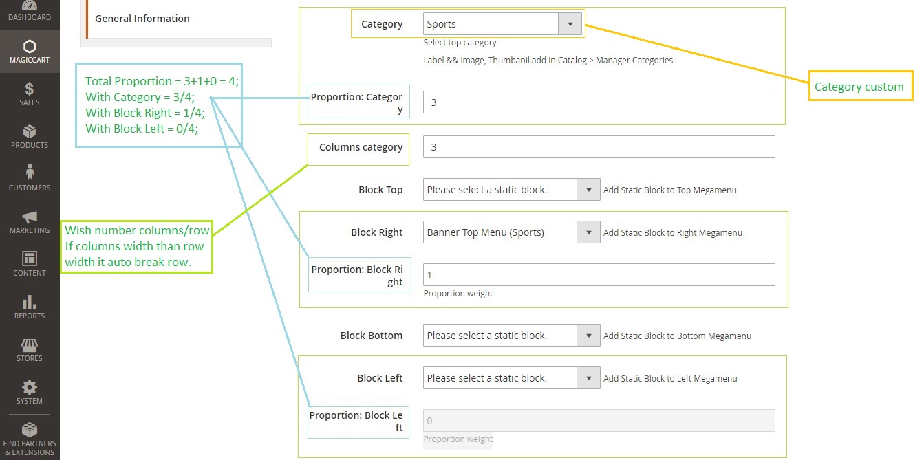 You must log in Admin > STORES > Configuration > Magic Menu to config. It might look like this: