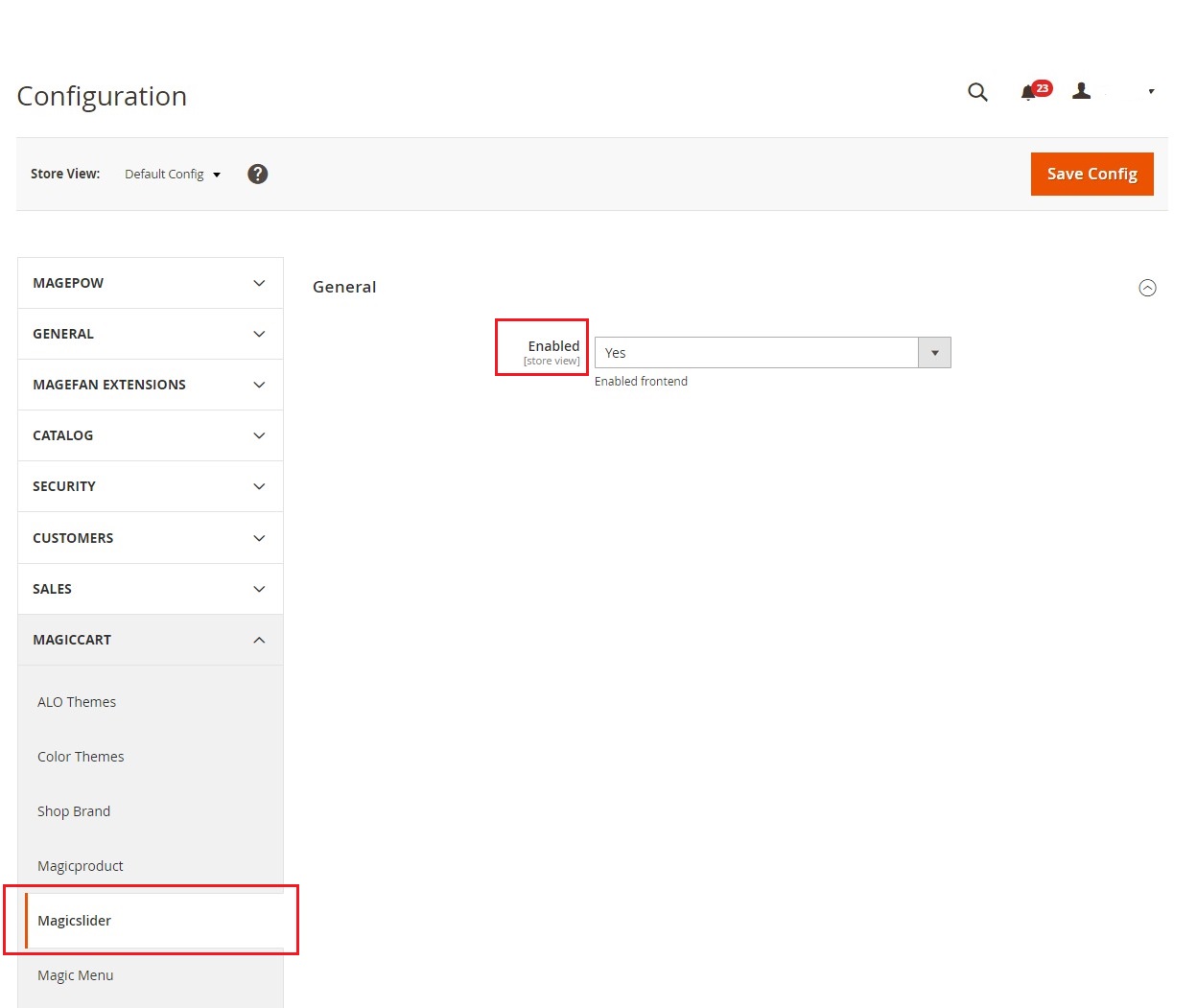 To Enable/Disable Magic Sliders, You go to Admin > Magiccart > Alo Themes > Configuration > MAGICCART > Magicslider as the image below