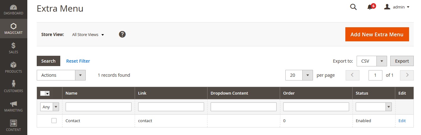 You can log in Admin > Magiccart > Magic Menu > Extra Menu. It will look like this: