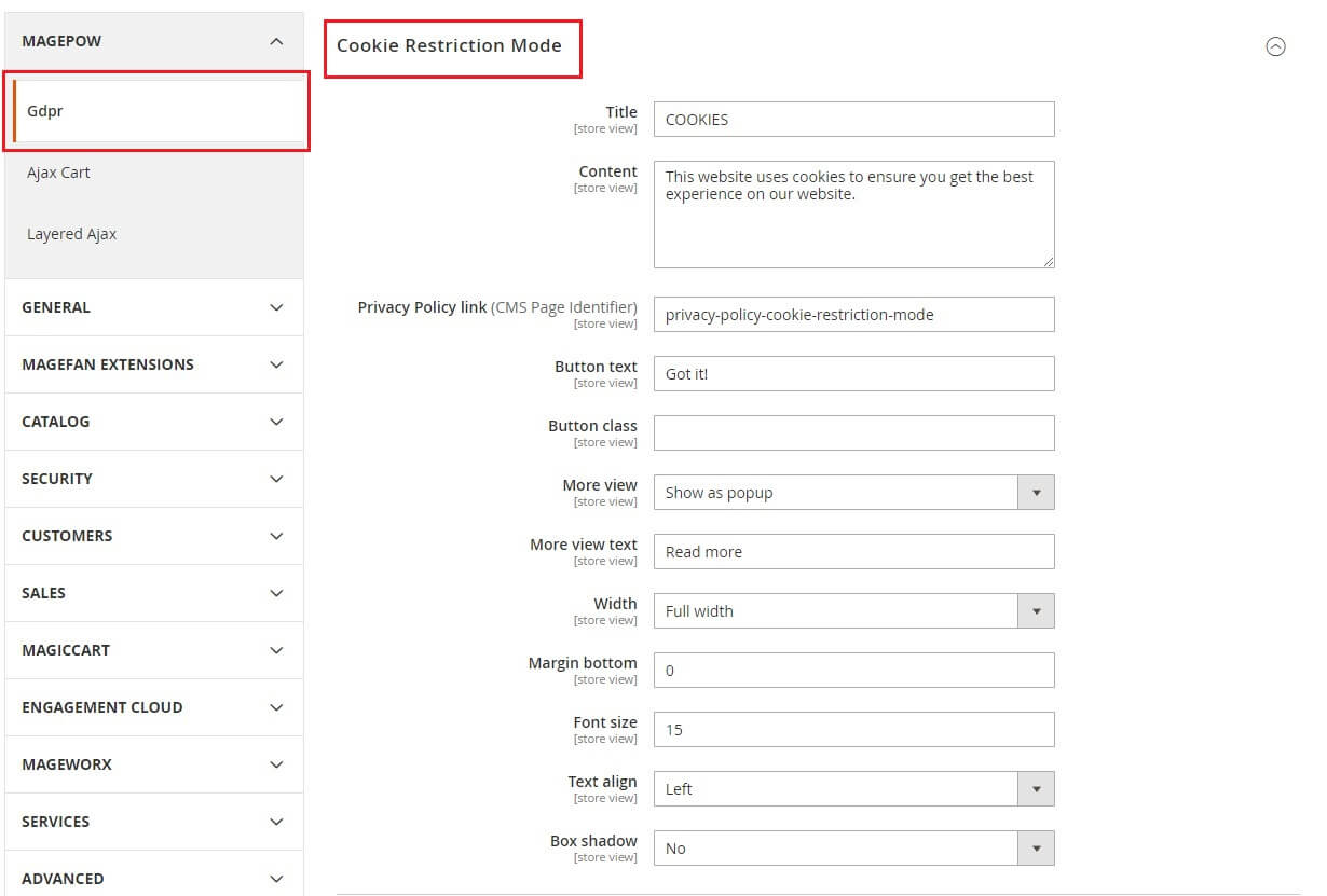 To Config and Manage Ajax Cart, go to Admin Panel > Stores > Settings > Configuration > MAGEPOW > Gdpr as the image below