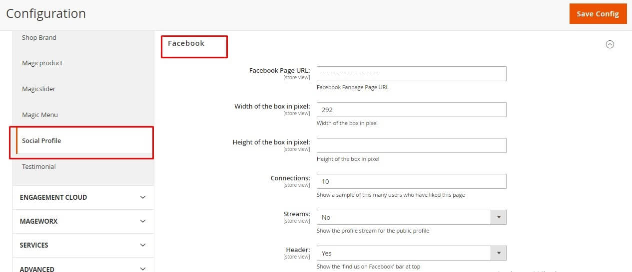 To config and manage Social Profile you go to Admin > Magiccart > ALO themes > Configuration > Social Profile as image below