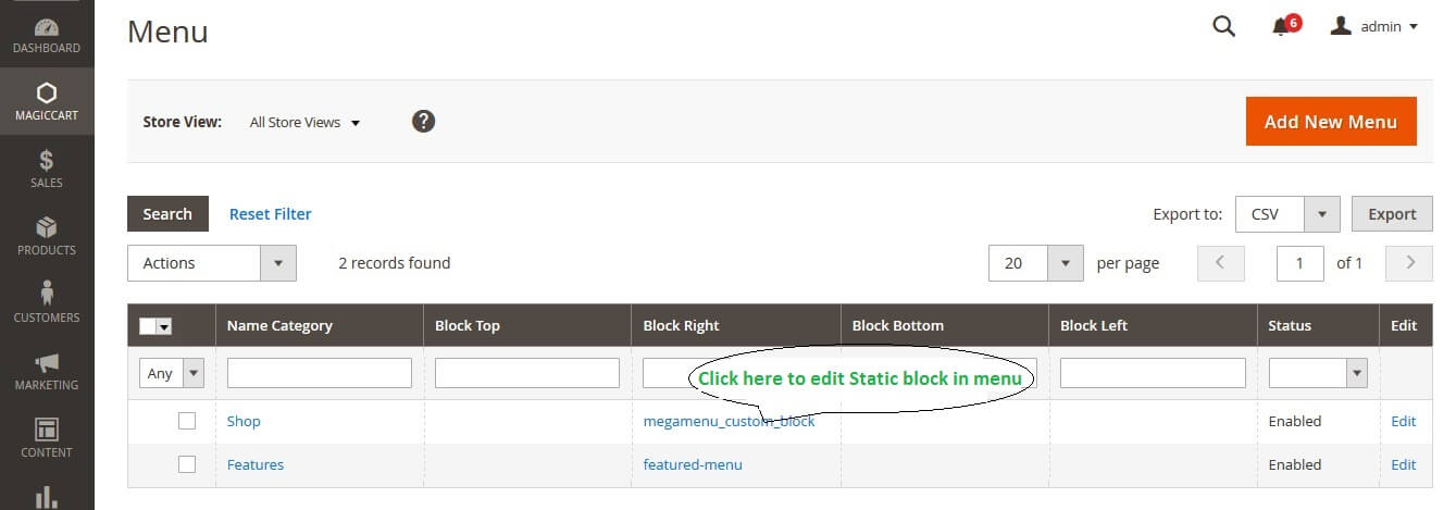 You can log in Admin > Magiccart > Magic Menu > Menu. It will look like this: