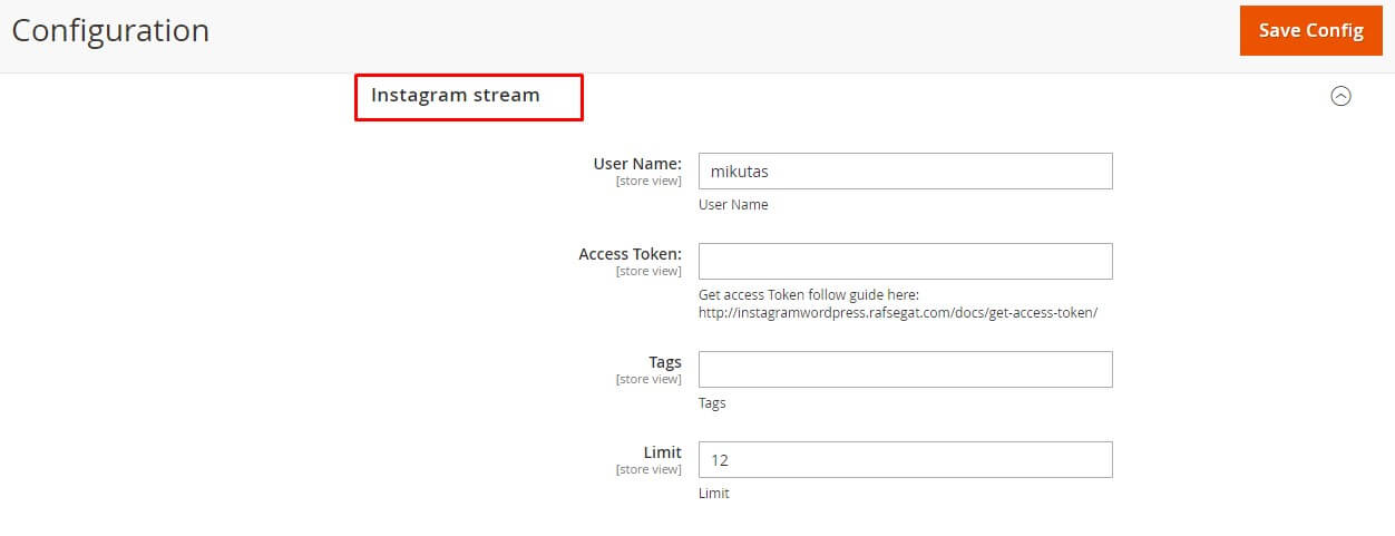 To config, manage Instagram stream, go to Admin > Magiccart > ALO themes > Configuration > Social Profile > Instagram stream as image below