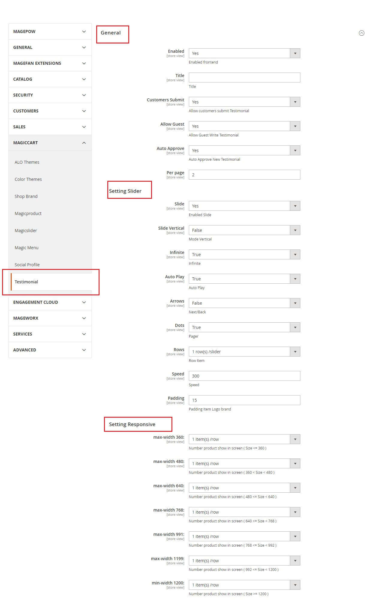 "General": Config general information for testimonial such as Enabled/Disable, Title for testimonial, number per page...