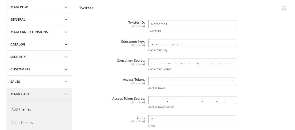 Go to Admin > Magiccart > ALO themes > Configuration > Social Profile > Twitter as image below