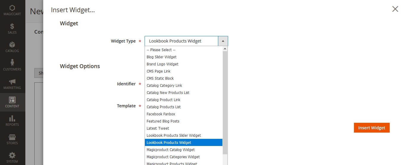 Then choose the "Widget Type" is Magicslider Widget and choose the Identifier and Template for the slider as the image below: