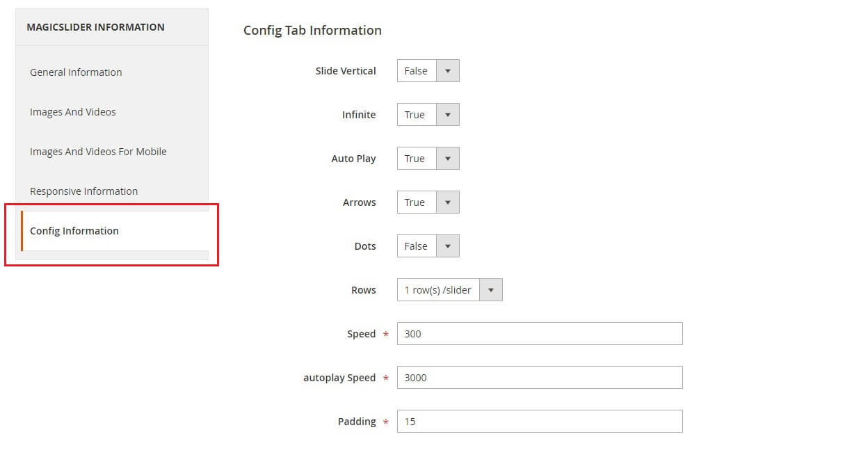 Config Information: Allows you can config other information for the Slider such as Slide Vertical, Infinite, Auto Play, Speed,...